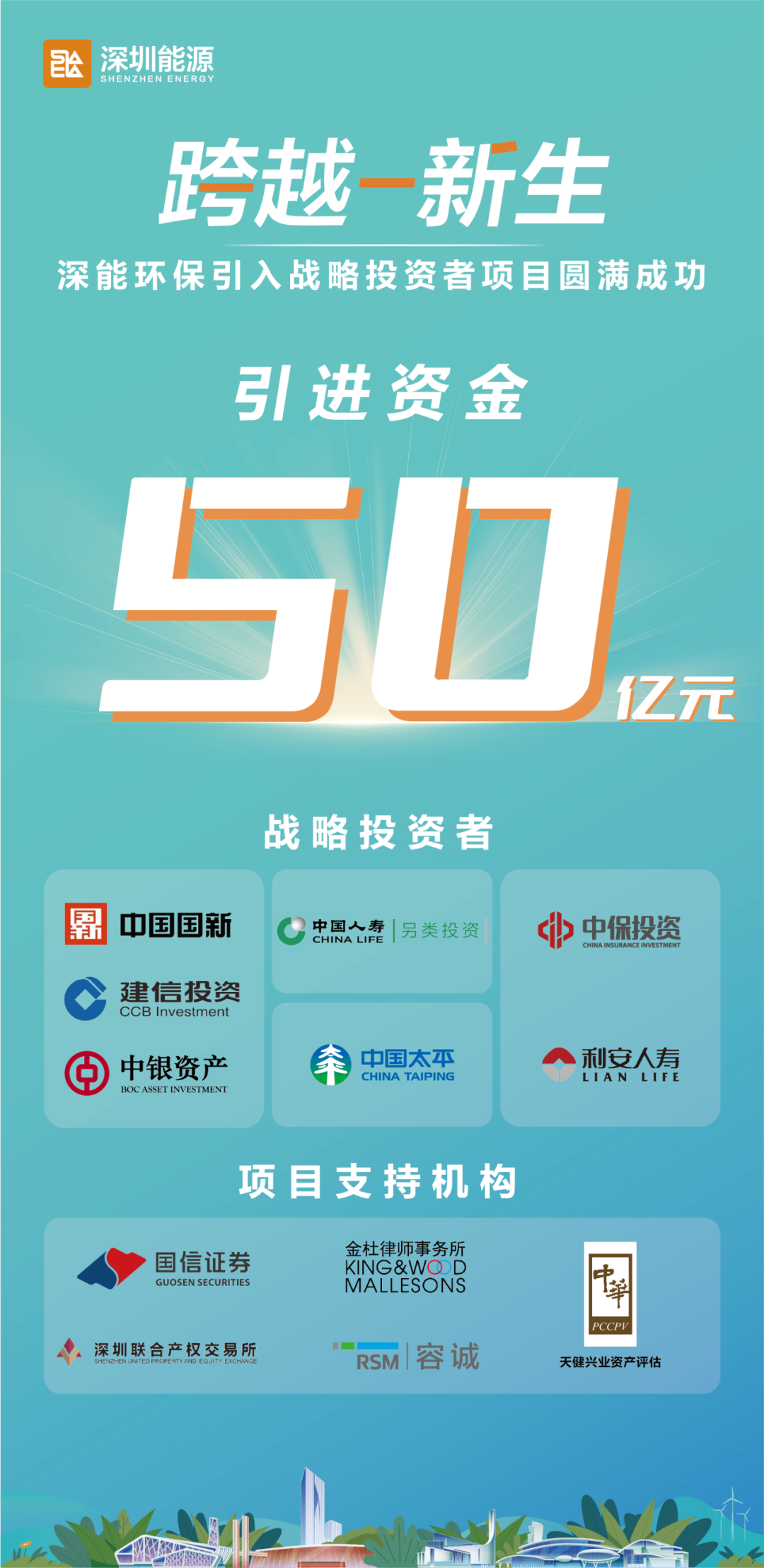 为深化战略布局,实现高质量发展目标,深圳能源环保股份有限公司通过在深圳联交所公开挂牌的方式,成功引入国新建源股权投资基金(成都)合伙企业(有限合伙)、国新中鑫私募股权投资基金(青岛)合伙企业(有限合伙)、国寿投资保险资产管理有限公司、中保投义安(上海)私募基金合伙企业(有限合伙)、太平人寿保险有限公司等5家战略投资者,募集资金人民币50亿元。